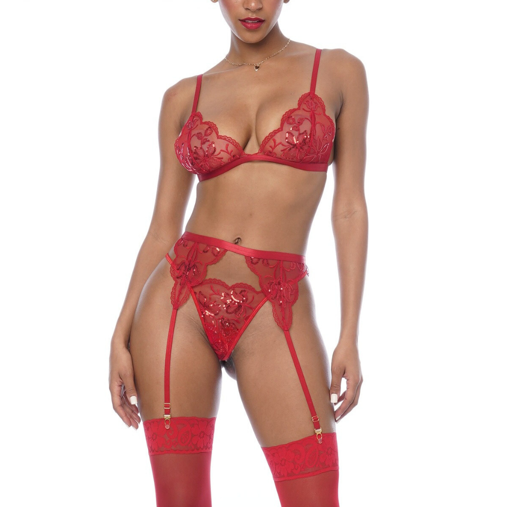 Este lujoso conjunto de malla con bordados de lentejuelas y detalles florales en un rojo vibrante es todo lo que necesitas esta temporada. Diseñado para resaltar tu sensualidad y elegancia, cada pieza ha sido elaborada con materiales de alta calidad para ofrecerte el máximo confort sin sacrificar estilo. Este conjunto de tres piezas incluye un bralette con tirantes ajustables, liguero y tanga a juego, ideales para una ocasión especial o para sentirte increíble todos los días.